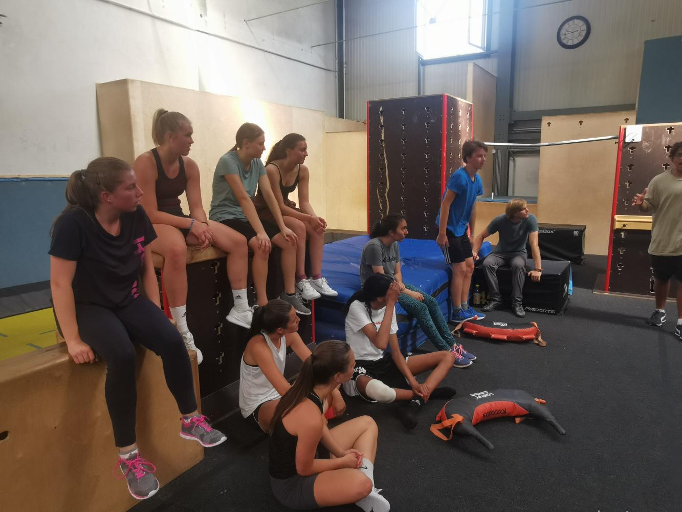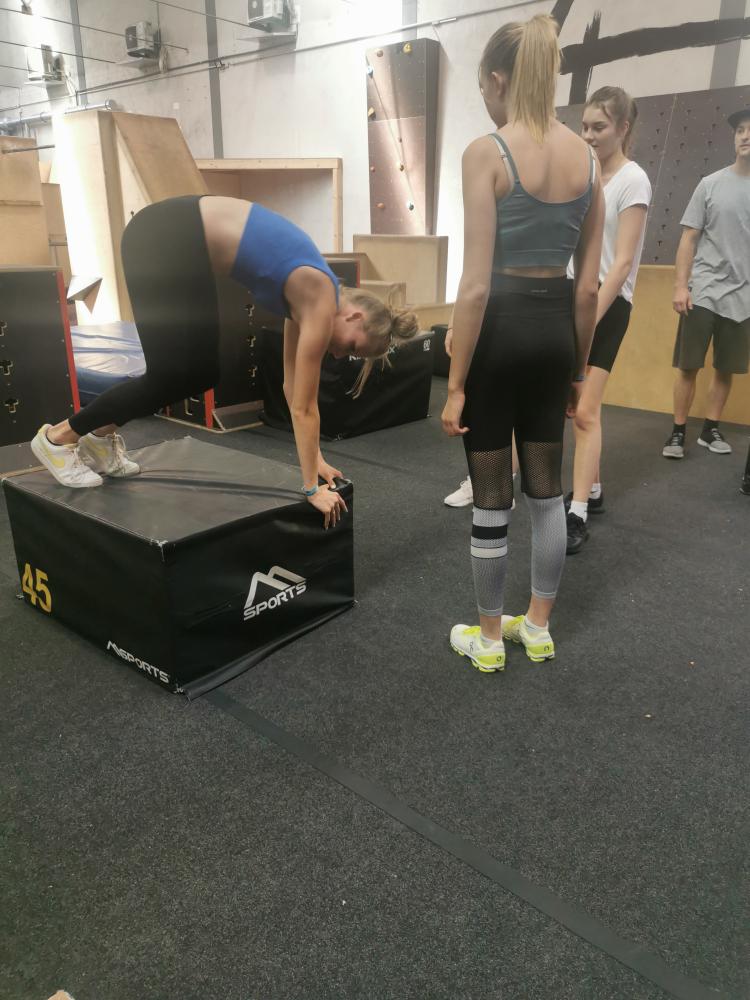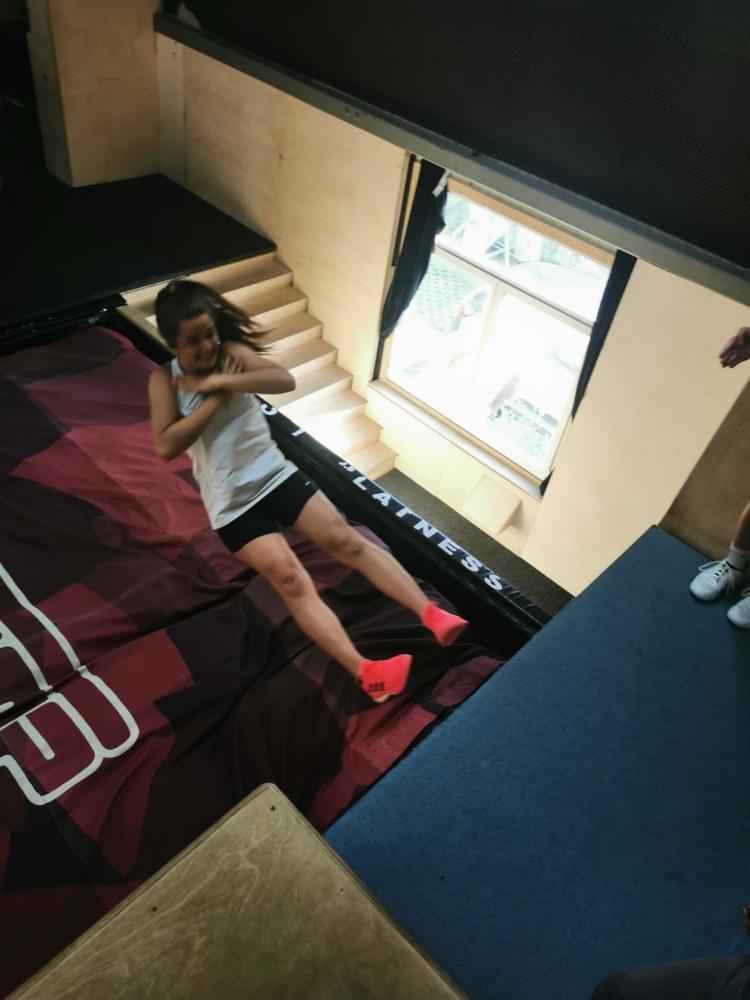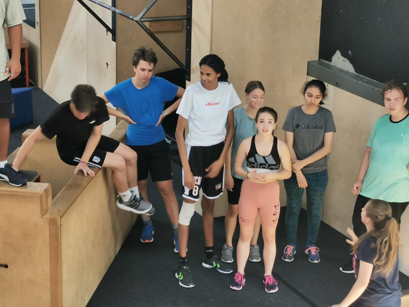 Mit freundlicher Unterstützung von 4 Elements konnten sich die Schülerinnen in der Halle austoben. Zuerst wurde aufgewärmt und anschließend einige spezielle Pacourelemente gelernt. Eine große Spielhalle, mit Airtrackkissen, Trampolins, Reckstangen und vielen mehr Hindernissen stand den SchülerInnen zur Verfügung. Mit professioneller Hilfe gelangen gleich ein paar Tricks.