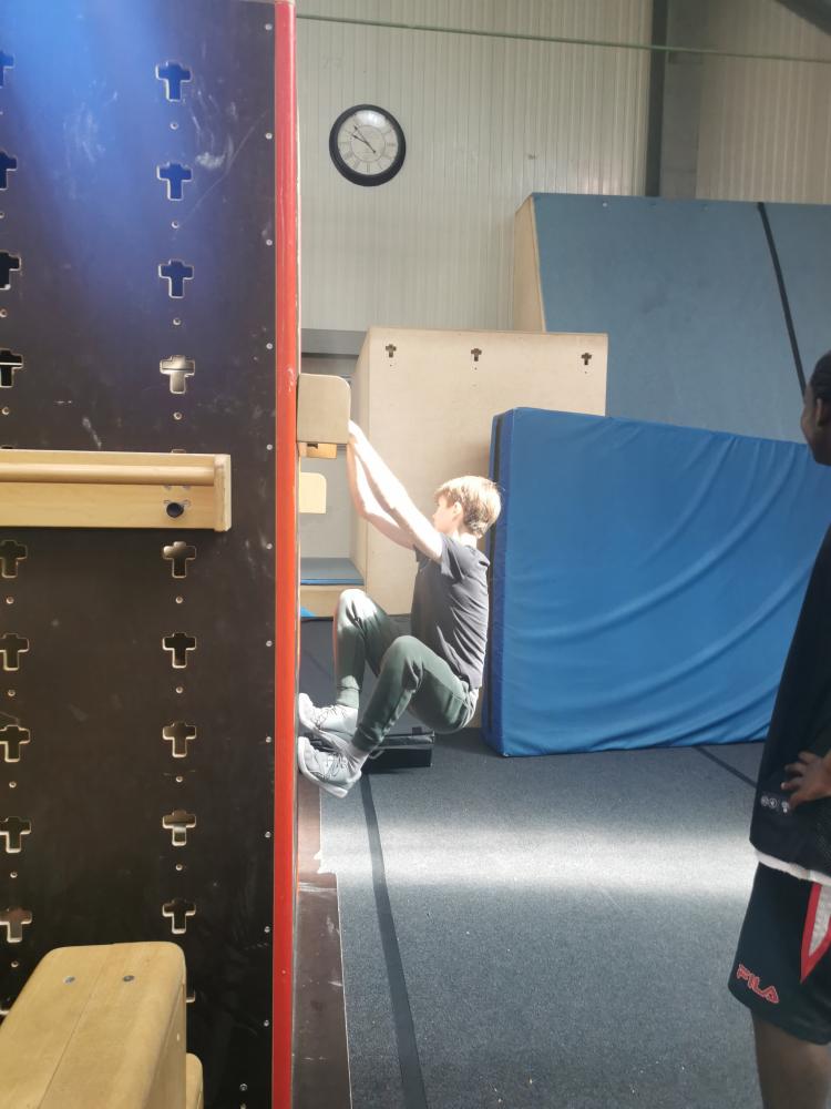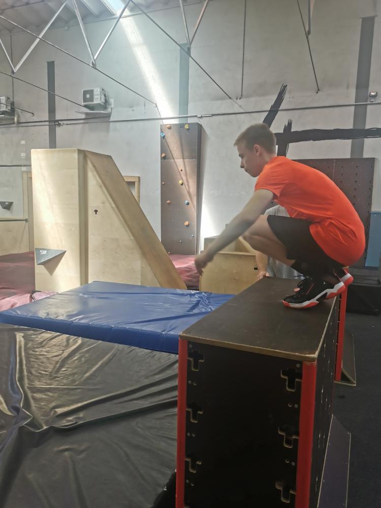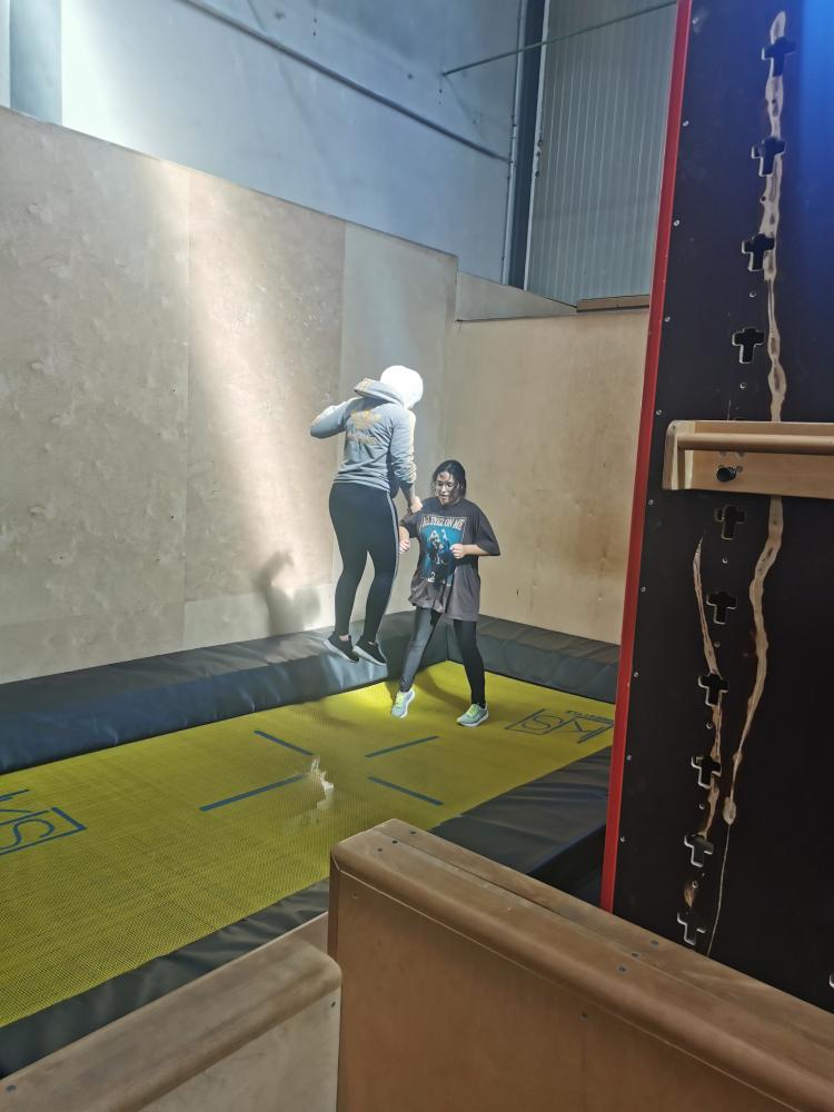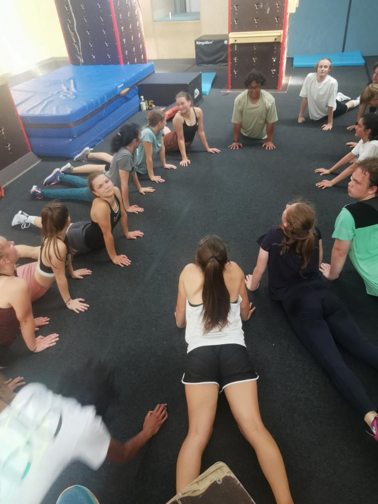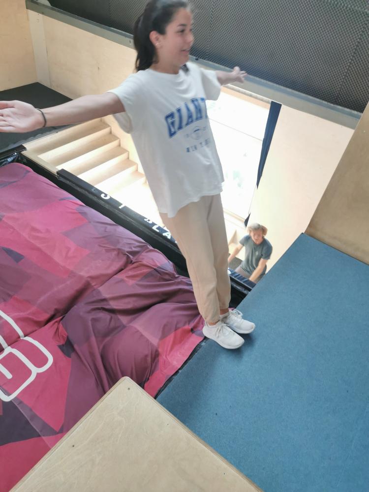 Mit freundlicher Unterstützung von 4 Elements konnten sich die Schülerinnen in der Halle austoben. Zuerst wurde aufgewärmt und anschließend einige spezielle Pacourelemente gelernt. Eine große Spielhalle, mit Airtrackkissen, Trampolins, Reckstangen und vielen mehr Hindernissen stand den SchülerInnen zur Verfügung. Mit professioneller Hilfe gelangen gleich ein paar Tricks.
