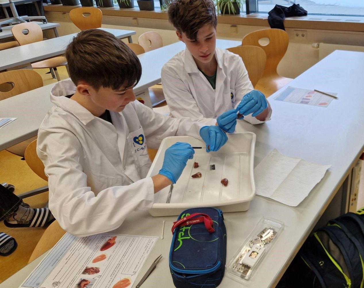 In der 4c stand diese Woche eine besonders aufregende Unterrichtsstunde bevor: das erste Mal sezieren. Viele Schüler:innen mussten zunächst etwas Überwindung aufbringen, um Skalpell und Präparierbesteck in die Hand zu nehmen. Doch Schritt für Schritt entdeckten sie, wie spannend der Blick ins Innere eines Hühnerherzens ist. Sie konnten Kammern, Herzklappen und Blutgefäße erkennen und lernten direkt am Objekt, wie ein Herz aufgebaut ist. So wird Biologie „lebendig“ und zeigt, wie faszinierend Lernen sein kann.