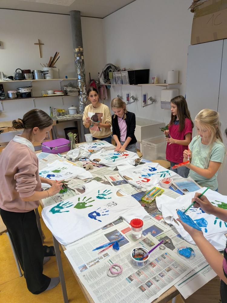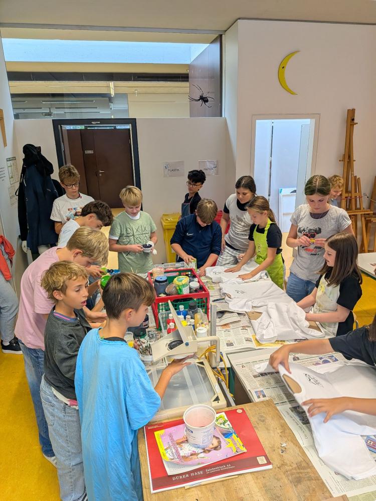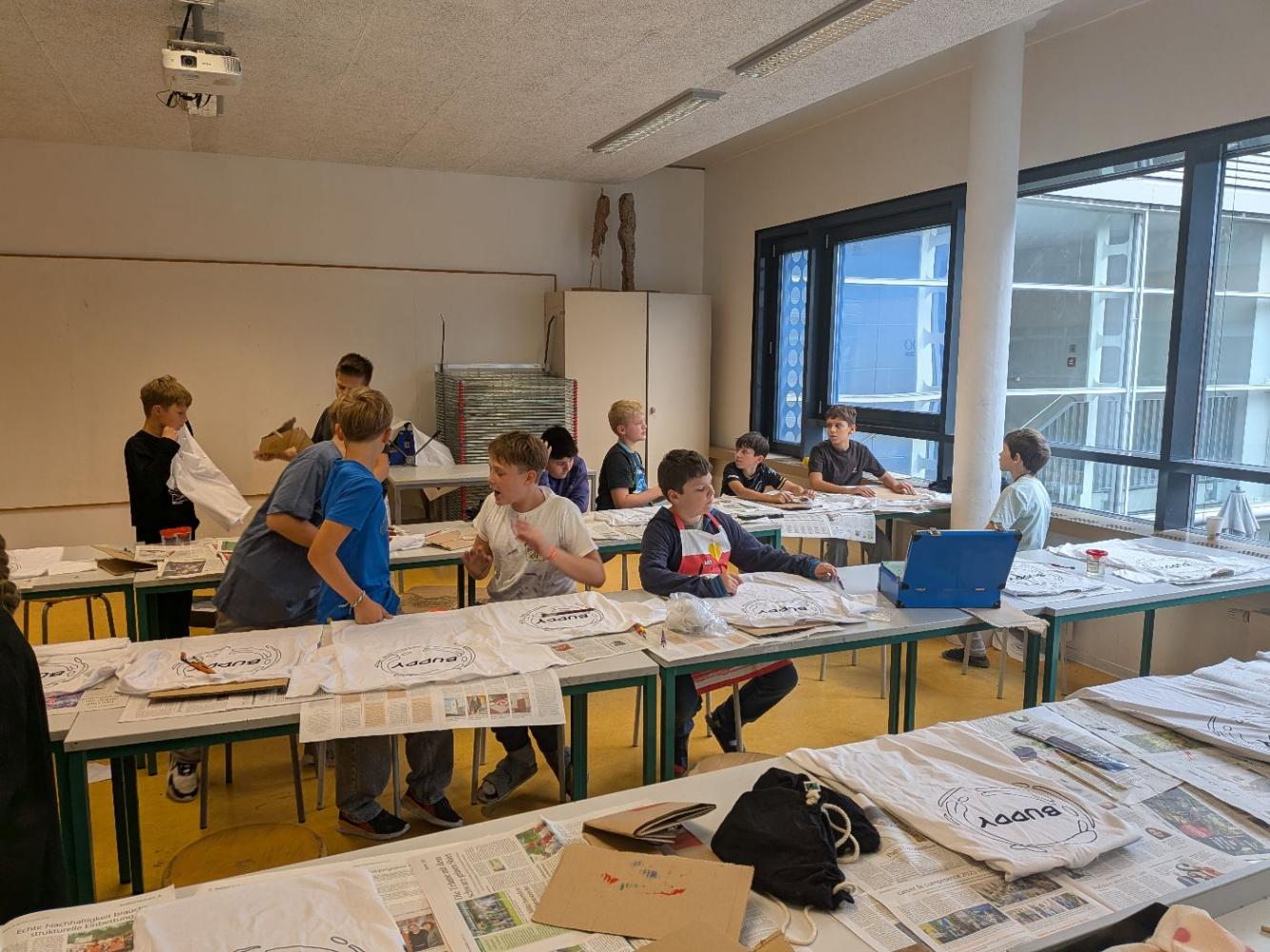 Zuerst wurde gemeinsam gejausnet, dann ging es auf zu den Werkräumen im zweiten Stock. Nach kurzer Anleitung wurde fleißig bemalt, geföhnt und gebügelt. Das Ergebnis kann sich sehen lassen. Die Werke können am Tag der offenen Tür bestaunt werden. Die anderen ersten Klassen werden folgen. Am 30.09.2025 trafen sich die Buddys aus der 3a mit der Klasse 1b, auch hier wurden T-Shirts gestaltet.