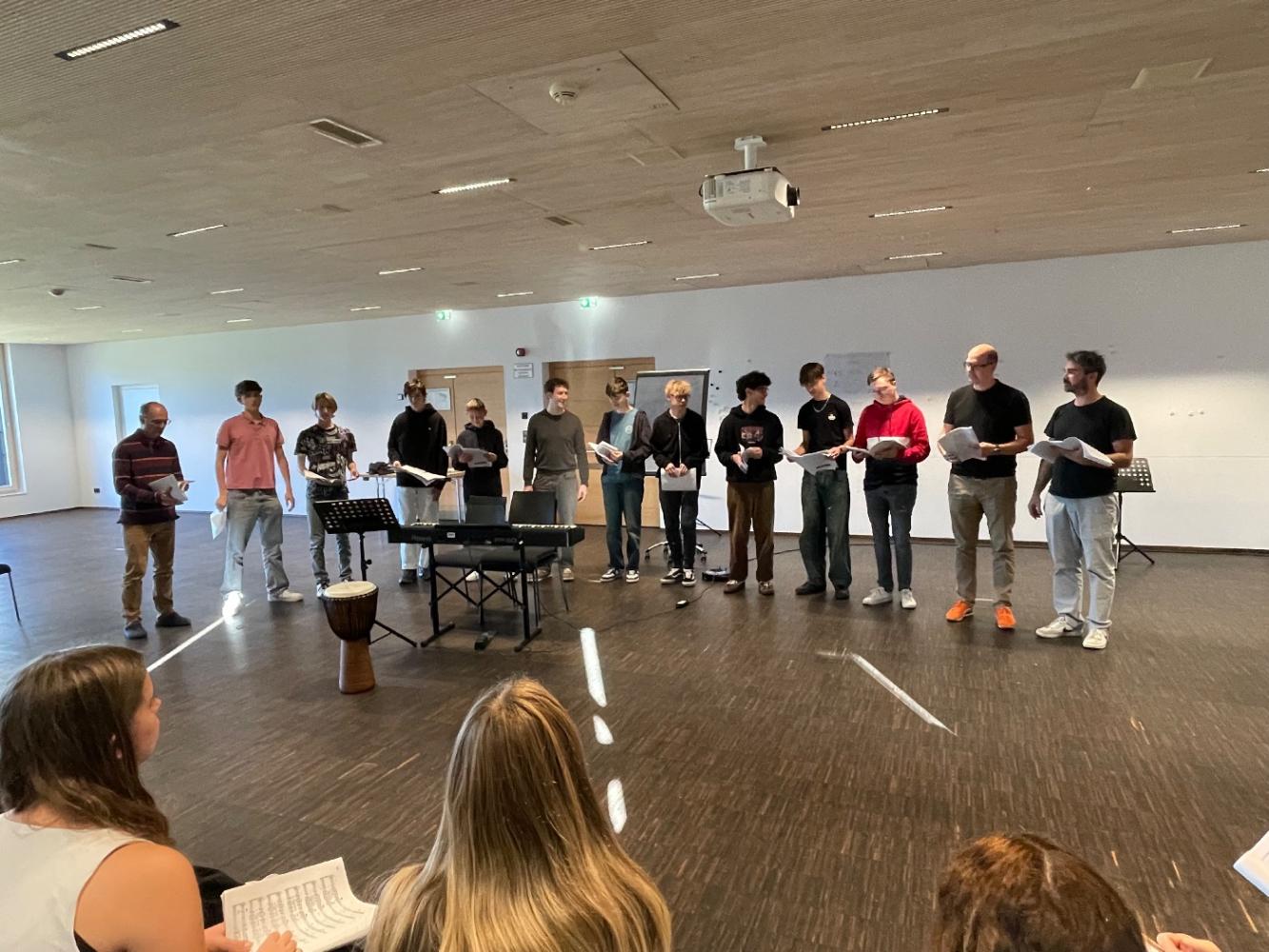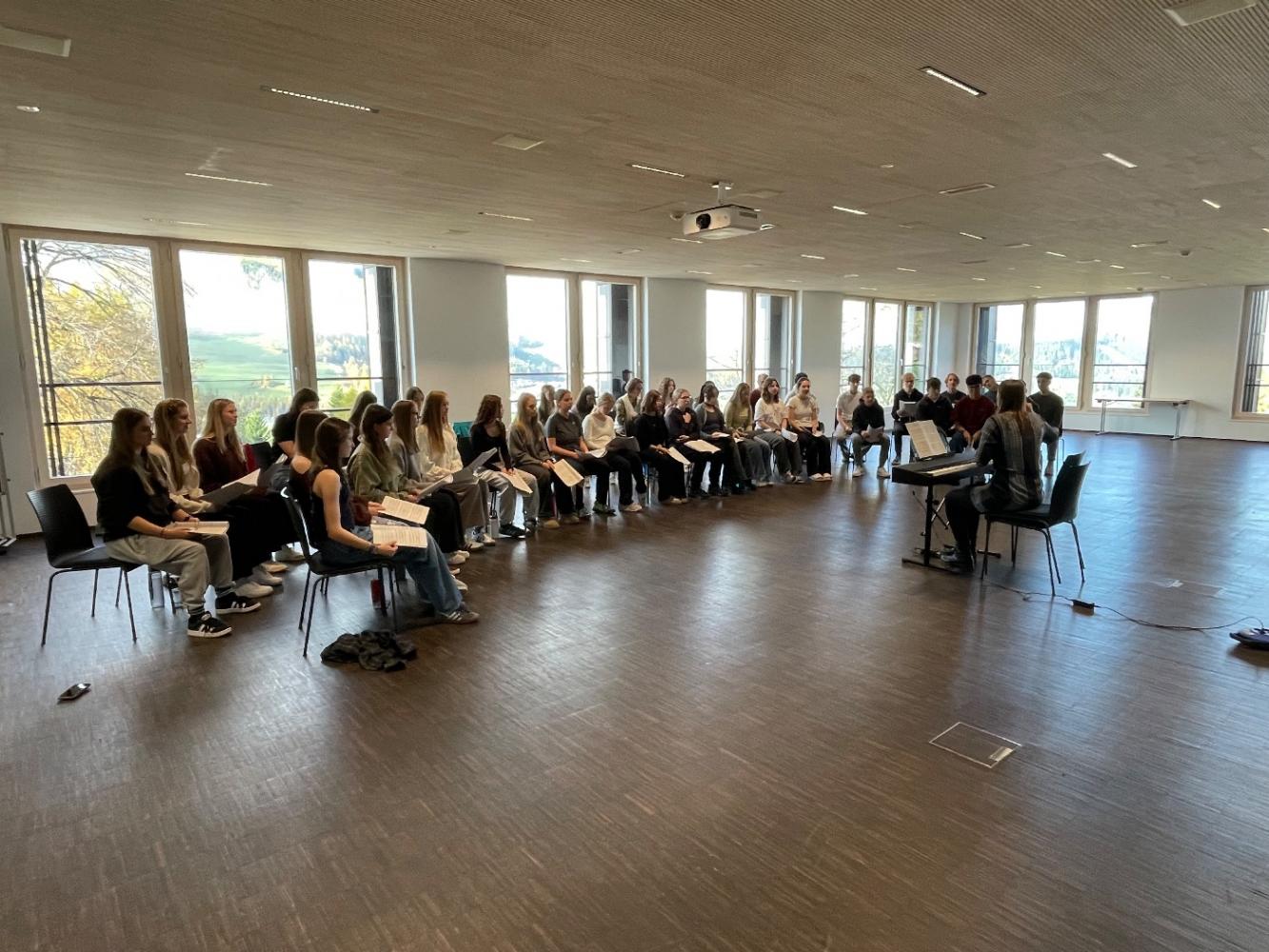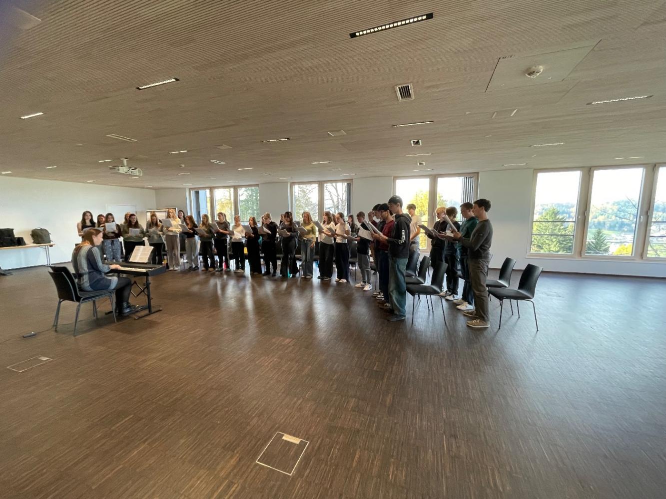 32 sangesfreudige Teenager und 9 Lehrpersonen in abwechselnder Präsenz, probten sich durch unterschiedlichste Genres, von Klassik über Pop bis hin zur Weltmusik. Manches wurde a-cappella gesungen, manches mit einem schwungvollen Klavierpart oder auch Djembe oder Cajon unterlegt.